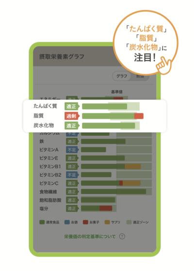 理想的なバランスは、たんぱく質13〜20%、脂質20〜30%、炭水化物50〜65%(18歳〜50歳未満の男女の割合)です。あすけんで食事記録をすると、栄養素グラフで簡単に過不足をチェックできます。
